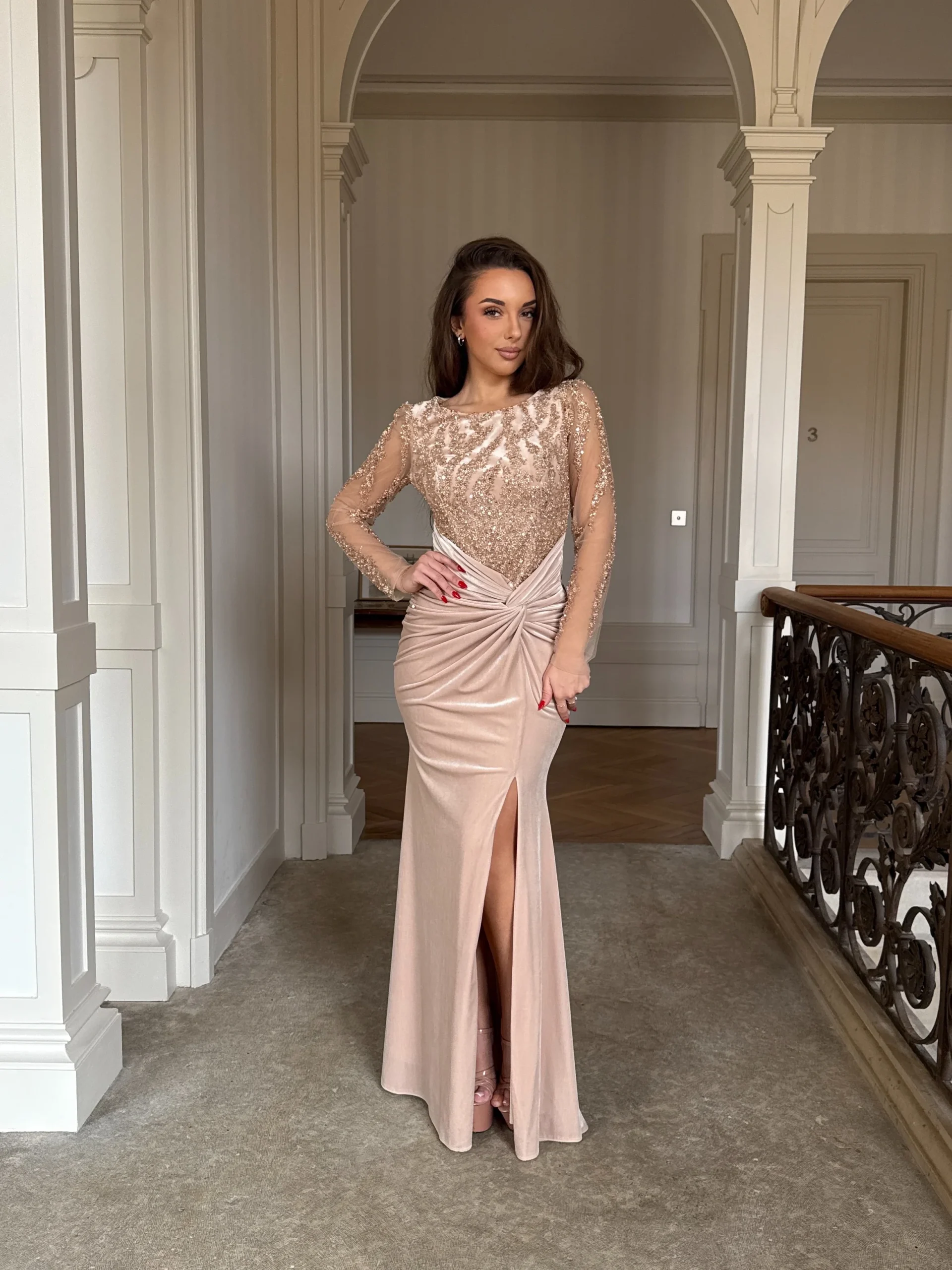 La robe de soirée élégante beige en velours est une pièce incontournable pour celles qui recherchent à la fois raffinement et confort lors des événements prestigieux.