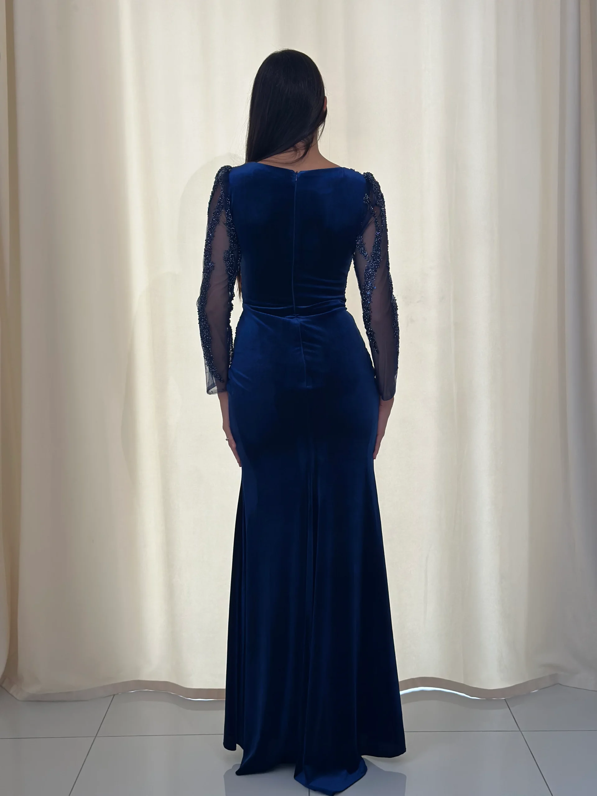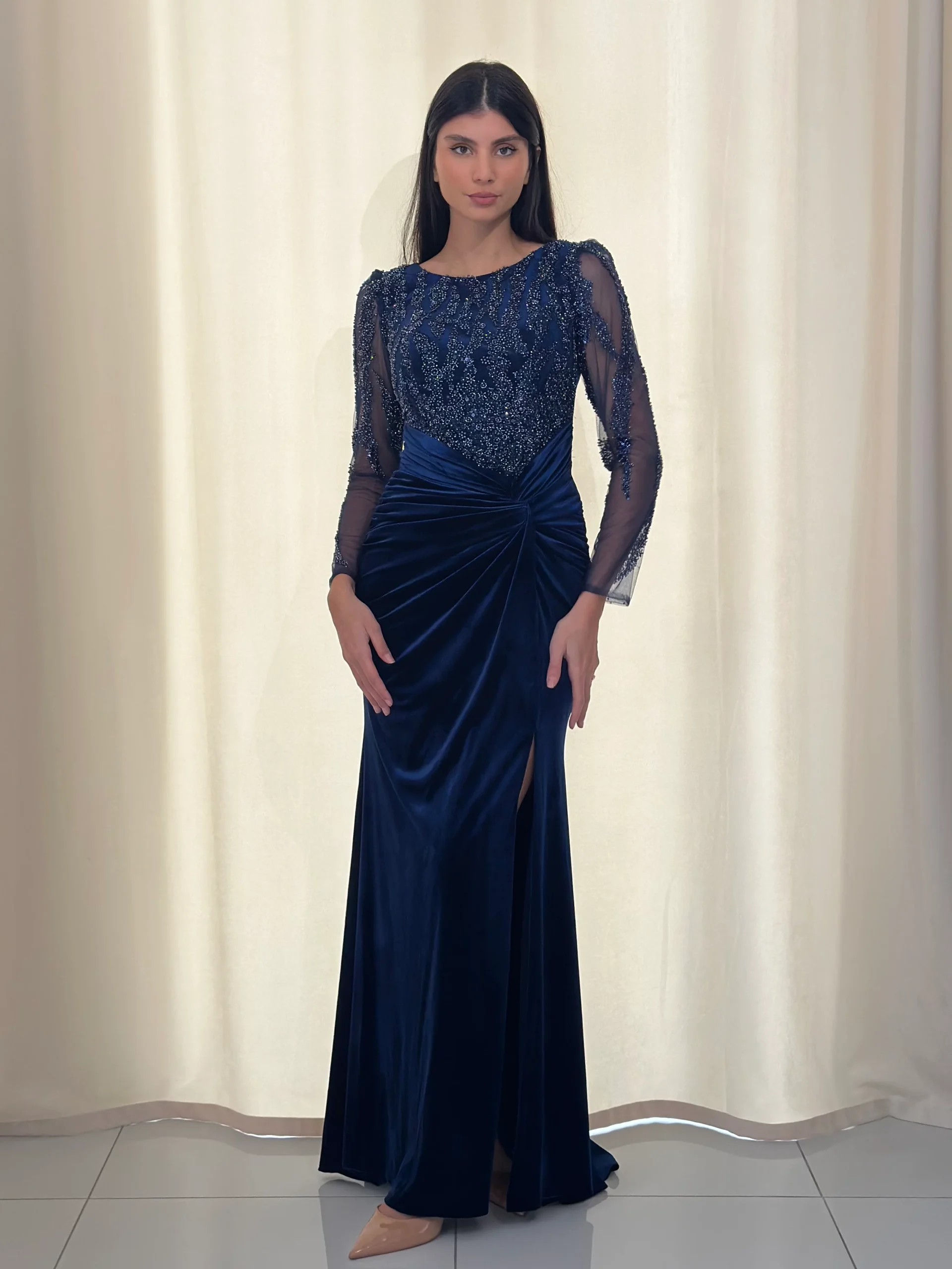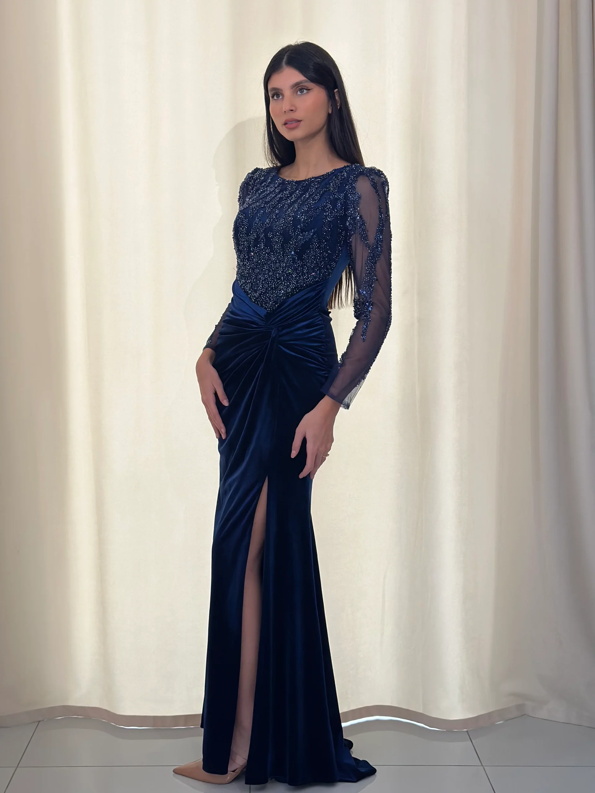 La robe de soirée chic bleu marine en velours est une pièce idéale pour sublimer vos soirées et événements prestigieux. D’emblée, sa teinte bleu marine, à la fois intemporelle et sophistiquée, confère une élégance naturelle. Par ailleurs, le velours, matière noble par excellence, apporte une touche de douceur et de chaleur tout en reflétant subtilement la lumière.